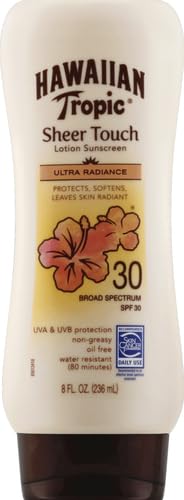 Details: Hawaiian Tropic Sheer Touch Ultra Radiance SPF 30 sunscreen lotion offers triple enhancement for radiant skin; it protects, softens, and leaves skin glowing. This luxurious moisturizing sunscreen formula has a hint of sheen and leaves your skin soft and luminous. Hawaiian Tropic Sheer Touch sunscreen lotion offers broad spectrum UVA and UVB protection in an oil-free and non-greasy formula. This ultra-conditioning formula contains Vitamins C & E, with mango fruit extract and a shea butter complex for skin-loving suncare you can trust. We care for your skin with broad spectrum UVA and UVB protection, and we also do our part to help care for the planet by creating Cruelty-Free sunscreen that’s free from oxybenzone and octinoxate.